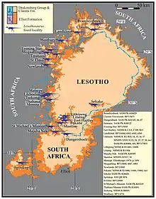 Lesothosaurus is known from fossils found in formations of the Karoo Supergroup, including the Upper Elliot Formation and the Clarens Formation, which date to the Hettangian and Sinemurian ages of the Lower Jurassic, around 200–190 million years ago. Originally, Lesothosaurus was thought to be from the Upper Triassic period. The Upper Elliot Formation consists of red/purple mudstone and red/white sandstone, whereas the slightly younger Clarens Formation consists of white/cream-coloured sandstone. The Clarens Formation is less rich in fossils than the Upper Elliot Formation; its sediments also often form cliffs, restricting accessibility for fossil hunters.[27][28] The Upper Elliot Formation is characterised by animals that appear to be more lightly built than those of the Lower Elliot Formation, which may have been an adaptation to the drier climate at this time in southern Africa. Both formations are famous for their abundant vertebrate fossils, including temnospondyl amphibians, turtles, lepidosaurs, aetosaurs, crocodylomorphs, and non-mammal cynodonts.[28][29]