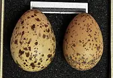 The lesser black-backed gull is smaller than the European herring gull. The taxonomy of the herring gull / lesser black-backed gull complex is very complicated; different authorities recognise between two and eight species. This group has a ring species distribution around the Northern Hemisphere. Differences between adjacent forms in this ring are fairly small, but by the time the circuit is completed, the end members, herring gull and lesser black-backed gull, are clearly different species. The lesser black-backed gull measures 51–64 cm (20–25 in), 124–150 cm (49–59 in) across the wings, and weighs 452–1,100 g (0.996–2.425 lb), with the nominate race averaging slightly smaller than the other two subspecies.[4] Males, at an average weight of 824 g (1.817 lb), are slightly larger than females, at an average of 708 g (1.561 lb). Among standard measurements, the wing chord is 38 to 45 cm (15 to 18 in), the bill is 4.2 to 5.8 cm (1.7 to 2.3 in), and the tarsus is 5.2 to 6.9 cm (2.0 to 2.7 in).[5][6][7] A confusable species is the great black-backed gull. The lesser is a much smaller bird, with slimmer build, yellow rather than pinkish legs, and smaller white "mirrors" at the wing tips. The adults have black or dark grey wings (depending on race) and back. The bill is yellow with a red spot at which the young peck, inducing feeding (see fixed action pattern). The head is greyer in winter, unlike great black-backed gulls. Annual moult for adults begins between May and August and is not complete on some birds until November. Partial prebreeding moult occurs between January and April.[8]