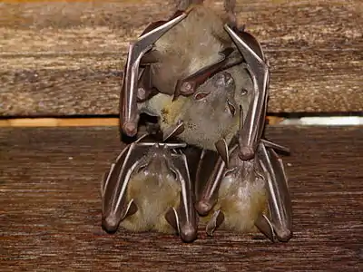 The lesser short-nosed fruit bat (Cynopterus brachyotis) is a species of megabat within the family Pteropodidae.[2] It is a small bat that lives in South Asia and Southeast Asia. It weighs between 21 and 32 grams (0.74 and 1.13 oz), and measures 70 to 127 millimetres (2.8 to 5.0 in).[3] It occurs in many types of habitat, but most frequently in disturbed forest, including lower montane forest and tropical lowland rain forest, plus gardens, mangroves, and vegetation on beaches.[4]