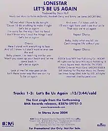 "Let's Be Us Again" is a song recorded by American country music group Lonestar. The song reached the Top 5 on the Billboard Hot Country Singles & Tracks (now Hot Country Songs) charts. It was released in March 2004 as the first single and title track from their album of the same name. Then-lead singer Richie McDonald co-wrote the song with Maribeth Derry and Tommy Lee James.[1]