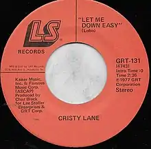 "Let Me Down Easy" was issued as a single in August 1977 on LS Records. It was backed on the B-side by "This Is The First Time (I've Seen The Last Time On Your Face)".[6] The single spent multiple weeks on the Billboard Hot Country Singles chart and eventually reached number seven. It became Lane's first major hit as a country artist and her first of several top ten hit records.[7] The track also peaked at number 28 on the Canadian RPM Country Songs chart, becoming her first single to chart there.[8] "Let Me Down Easy" was included on Lane's second studio record, which was issued in 1978 titled Cristy Lane Is the Name.[9] In their review of Cristy Lane Is the Name, Billboard magazine named "Let Me Down Easy" among the record's "best cuts".[4] In later years, Lindsay Planer of AllMusic positively commented on the song, calling it a "hot-steppin' break-up song".[10]