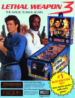 Lethal Weapon 3 is a pinball machine produced by Data East Pinball in 1992.[1] It is based on the movie of the same name, which was the most popular film in summer 1992. The game featured a Generation 3 FullView dot matrix display, which was larger than the current industry standard, and displayed digitized movie clips.[1] The game also featured a hidden leveling system, in which players "grab hold of the Data East gun handle and eliminate bad guys in one of three video crime simulator shoot outs".[1] By 1994, it was Data East's all-time most successful pinball machine.[2] The game was designed by Markus Rothkranz.[3]