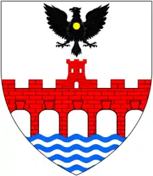 ![]() Escutcheon of the Lethbridge baronets of Westaway House and Winkley Court. Canting arms: Argent, over water proper, a bridge of five arches embattled gules and over the centre arch a turret in chief an eagle displayed sable charged on the breast with a bezant[1] | |
