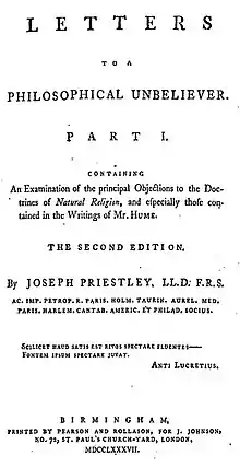 Letters to a Philosophical Unbeliever (1780) is a multi-volume series of books on metaphysics by eighteenth-century British polymath Joseph Priestley.