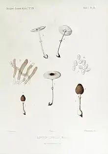 It was first described in 1905 by the French mycologist Jean Louis Émile Boudier who classified it as Lepiota tenella[3] accompanied with illustrations of the species.[4] It was reclassified as Leucocoprinus tenellus in 1943 by the French mycologist Marcel Locquin.[5]