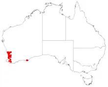 It is found in the IBRA Regions of: Geraldton Sandplains, Jarrah Forest, and the Swan Coastal Plain, growing on sandy and gravelly soils, on plains, low ridges, seasonally wet flats, and outcrops.[4]