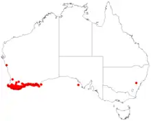 Subspecies obovatus grows in heath or low woodland in near-coastal areas between West Cape Howe and Israelite Bay[2][9] and subsp. revolutus is found in winter-wet heath, woodland and forest from near Margaret River to near Albany and north to near Manjimup in the Esperance Plains, Jarrah Forest and Warren bioregions of south-western Western Australia.[2][10]