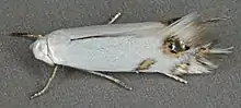 The adult is a tiny white moth about four millimeters long. It differs from Leucoptera laburnella as follows : forewings with anteapical spot of costa more oblique, its margins rather converging downwards, metallic post-tornal spot more broadly black-edged, usually preceded by a yellowish mark.[3]