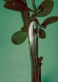 It lays eggs one at a time on the stem of Scotch broom, its host plant. The larva burrows throughout the epidermis of the stem for nearly a year before it pupates, causing damage to the plant.[1]