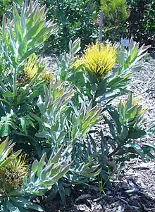 Leucospermum formosum is a large upright shrub of up to 3 m (9.8 ft) high, from the family Proteaceae. It grows from a single trunk and its branches are greyish felty. The softly felty leaves are lance-shaped to elliptic, 6+1⁄2–10 cm (2.6–3.9 in) long and 14–20 mm (0.55–0.79 in) wide. The flower heads are flattened and about 15 cm (5.9 in) across, and consist of bright yellow flowers from which long, styles emerge which are strongly clockwise bent just below the white, later pink thickened tip. From above, the heads look like turning wheels. It is called silver-leaf wheel-pincushion in English. It flowers during September and October. It is an endemic species of the Western Cape province of South Africa.[3][4]