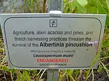 The Albertinia pincushion is considered endangered as it has a very limited distribution of below 169 km2 (65 sq mi) and is under thread by agricultural development, so-called field improvements to increase the yield of tall restionids for thatching, invasive species, urban expansion near Albertinia and climate change. The species can often only be found on roadsides, suggesting it has already disappeared from the surrounding fields.[3]