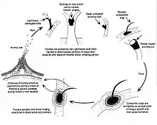 The fungus that causes disease overwinters in cankers or previously invaded dead wood. Environmental cues, such as cool, moist weather in the early spring, cause conidia to be released from pycnidia in sticky masses. The conidia are then spread via wind or water splashes. Conidia then germinate and the fungi begins to colonize provided that the environment is wet. The fungus is incapable of invading healthy bark and must enter the tree through injured, dying, or dead tissues.[3] Leucostoma commonly enters through weak, winter-killed twigs in the center of the tree. Moreover, it gains entry through winter-injured wood on limbs and trunks. It also can enter through short, dead pruning stubs, leaf scars, winter-killed buds on small twigs, and on poorly healed pruning cuts.