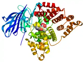 ![]() Crystallographic structure of LTA4H (rainbow colored N-terminus = blue, C-terminus = red) complexed with the protease inhibitor bestatin (space-filling model, carbon = white, oxygen = red, nitrogen = blue) based on the PDB: 1HS6 structure. | |||||||