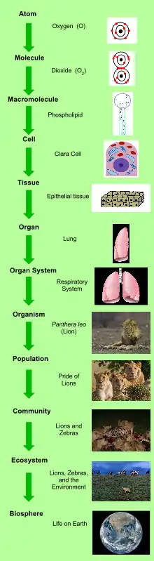 The simple standard biological organisation scheme, from the lowest level to the highest level, is as follows:[1]