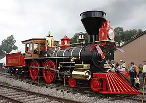Between 1999 and 2009, the Kloke Locomotive Works, run by Dave Kloke, constructed a full-size replica of the Leviathan, borrowing plans, research, blueprints, and patterns from the construction of the replica of the Jupiter by O'Connor Engineering, in order to match the specifications and details.[2] The replica however was also fitted with modern-day features upon construction, including an oil bunker, a small headlight on the rear of the tender, air brakes, and a varnished wooden cab. The replica made its first public appearance at the 2009 train festival in Owosso, Michigan, being hosted by the Steam Railroading Institute. Since then, the replica of the Leviathan has visited various tourist railroads and museums across the Midwest and Eastern United States for special events, including the Saratoga and North Creek Railway in North Creek, New York, the Illinois Railway Museum in Union, Illinois, and the Age of Steam Roundhouse in Sugarcreek, Ohio.[3][4][5]