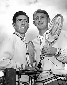 Hoad started the year with a five-set defeat in the final of the South Australian Championships against countryman Neale Fraser.[156] At the following Manly tournament, the crowd overflowed the stands during the final hindering Rosewall's "baseline defensive game" more than Hoad's attacking style, resulting in a straight-sets win for Hoad in 35 minutes.[157] At the Australian Championships in Brisbane, Hoad overcame a two sets to one deficit against Mervyn Rose in the quarterfinal and beat Neale Fraser in the semifinal to reach his second consecutive Australian final, where he overcame titleholder Rosewall in four sets to win his first Grand Slam singles title.[158][159] He won the doubles title with Rosewall against Don Candy and Mervyn Rose. At the beginning of March, Hoad and his wife left for an overseas private tour (a tour sanctioned but not organised by the Australian tennis federation).[160][161] First stop of the tour was Cairo where Hoad won the singles title at the Egyptian Championships against Sven Davidson followed by a tournament win in Alexandria over Fred Kovaleski.[162][163] At Monte Carlo in late March, he was surprisingly beaten by Tony Vincent in the quarterfinal.[164] In the Australian ranking published in April, reflecting the season until the end of March, Hoad overtook Rosewall as No. 1.[165] Singles titles at the Lebanese Championships and at the Connaught Club in Essex followed in April but the month ended with a semifinal loss to Ham Richardson at the British Hard Court Championships in Bournemouth.[166][167][168]