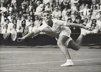 Hoad won his first Italian Championships on red clay at the Foro Italico in Rome in early May when he outplayed Sven Davidson in straight sets.[169] At the French Championships at Roland Garros, Hoad survived a five-set scare against Robert Abdesselam in the third round before winning the final against Sven Davidson in straight sets to claim his second consecutive Grand Slam singles title.[170][171] Unknown to the public, Hoad had stayed up the night previous to the final, invited by a Russian diplomat, and was drunk when he came home. An intensive workout by Rod Laver got him into a state that allowed him to play the final.[172] Following the win in Paris, Hoad stated his intention to remain amateur after 1956, "Even if I win the three big tournaments,[173] even if Kramer raised his offer, I still wouldn't turn pro for at least two or three seasons."[174] In May, Hoad won the International Golden Ball tournament in Wiesbaden, West Germany after a straight-sets victory in the final over Art Larsen but at the Trofeo Conde de Godó in Barcelona, he lost in the quarterfinal to Bob Howe.[175][176] As a preparation for Wimbledon, Hoad played the singles event at the Northern Championships in Manchester but lost to 34-year old Jaroslav Drobný in the final 7–5 in the deciding set.[177][178] Hoad was seeded first for the Wimbledon Championships. He lost two sets en route to the final, one to Mal Anderson in the quarterfinal and one to Ham Richardson in the semifinal. In the final he faced Rosewall. In the first all-Australian final since 1922, Hoad was victorious in four sets to gain his first Wimbledon and third successive Grand Slam championship title.[179][180][181] Hoad also won the doubles title with Rosewall, their third Wimbledon title, defeating Orlando Sirola and Nicola Pietrangeli in the final in straight sets.[182] Following his Wimbledon title he lost in the semi-final of the Midlands tournament to Mike Davies.[183] In August, Hoad won the singles title at the German Championships, on clay at Hamburg, with a four-set defeat of Orlando Sirola in the final.[184]