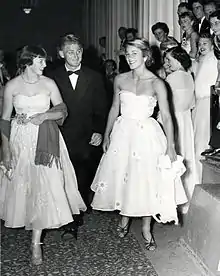 In January, Hoad played just one tournament before entering his National Service training. At the South Australian Championships in Adelaide he reached the final but sub-par play led to a straight-sets defeat to Trabert.[97] On 13 January, Hoad joined the 13th National Service Training battalion in Ingleburn for a period of 98 days and commented that "It will be a welcome break from tennis".[98] As a consequence, Hoad was unable to participate in the Australian Championships. At the end of February, Hoad received a leave from service to play for the Australian team at Kooyong stadium in the third Test match against South Africa in front of the Queen and the Duke of Edinburgh. He won a singles match against Abe Segal, won a doubles match with Rosewall and lost a mixed-doubles match with his girlfriend Jenny Staley.[99][100][101] When Hoad returned to service, he was bitten by a spider while on maneuvers which caused him to become ill and hospitalized him for ten days.[102] He spent two days in coma which was not made public.[103]