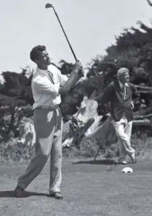 Roger Lapham was a founder of the Cypress Point Club golf course. In 1929, father (Roger) and son (Lewis) played a foursome there with Bobby Jones and Francis Ouimet. This attracted a large crowd and frayed the nerves of the 20-year-old Lewis. After one successful shot by Lewis, Bobby Jones loudly asked which golf club Lewis had used. Bobby Jones continued to solicit Lewis's advice in front of the crowd until the younger Lapham's confidence was restored.[6][7]