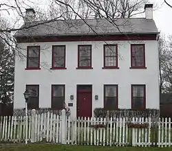 The main entrance to the house is located in the main part, in the middle lower part of the front facade. The main part has the majority of original parts from the 1840 house. It has the original four-panel wood door, a four-light transom, a smooth stone sill plate and a lintel. The windows are double hung and have 12 plates in each section, as well as sills and lintels. It has a chimney on each side of the house. The exterior has a molded cornice and a frieze. The roof is made of slate and it is believed that the roof slate was replaced in 1860. The walls of the main part have a small square attic vent on each side.[2]