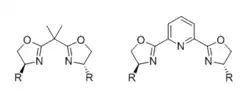 Most common chiral bisoxazoline (BOX) ligands consist of two identical chiral oxazoline moieties, substituted by a bulky group at the 4-positions, joined by a linker. The ligand is bidentate when the linker is a single carbon unit, but is tridentate (usually meridional) when the linker bears an additional coordinating atom, such as a pyridine nitrogen in the case of PyBOX ligands. The impact of ligand denticity and active intermediate geometry on the stereochemical outcome has been thoroughly reviewed.[44]