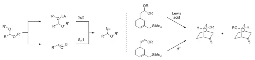 In reactions with polar mechanisms, Lewis acid catalysis often involves binding of the catalyst to Lewis basic heteroatoms and withdrawing electron density, which in turn facilitates heterolytic bond cleavage (in the case of Friedel-Crafts reaction) or directly activates the substrate toward nucleophilic attack (in the case of carbonyl addition reactions). The dichotomy can have important consequences in some reactions, as in the case of Lewis acid-promoted acetal substitution reactions, where the SN1 and SN2 mechanisms shown below may give different stereochemical outcomes. Studying the product ratio in a bicyclic system, Denmark and colleagues showed that both mechanisms could be operative depending on the denticity of the Lewis acid and the identity of the R' group.[3]