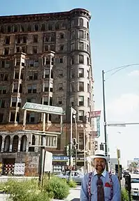 The Lexington Hotel was a ten-story[1] hotel in Chicago at 2135 S. Michigan Avenue[2] that was built in 1892 (or 1891[3]) for attendees of the Columbian Exposition.[4] The hotel is notable for being Al Capone's primary residence from July 1928 until his arrest in 1931.[5] After the Saint Valentine's Day Massacre, some commenters called the hotel "Capone's Castle."[6][7] It was later renamed "The New Michigan Hotel" and functioned as a brothel with 400 rooms.[3] The hotel closed in 1980.[4] On April 21, 1986, locked vaults found in the hotel were the subject of a live television program called The Mystery of Al Capone's Vaults, which received 30 million viewers. The building was demolished in 1995, despite its presence on the list of Chicago landmarks and the National Register of Historic Places.[8][9] The location where the hotel once stood is currently the site of a 296 unit residential high rise called "The Lex"[10] that was completed in 2012.