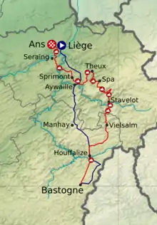 The route of Liège–Bastogne–Liège crosses the two eastern Walloon provinces, Liège and Luxembourg, from north to south and back. Its distance is more or less fixed at 250–260 km. The race starts in the center of Liège, after which the course follows a straightforward 95 km (59 mi) route southwards to Bastogne, and a winding 163 km (101 mi) route back to Liège.