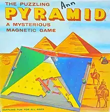 Puzzling Pyramid (1960) is a game for 2, 3 or 4 players of all ages. The object of the game is for each player to use a magnetic exploring wand to guide a steel ball up one of the four colored (yellow, red, green, blue) sides of a pyramid into a common treasure vault at the top. On the inside of each side of the pyramid, plastic tunnel blocks are placed by an opposing player before the start of the game, which are designed to impede the wand user's progress to the top, however at least one open path must be provided.[17][18]