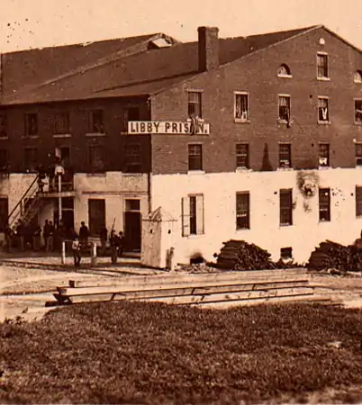 At the outbreak of the Civil War, Luther Libby was running a ship supply shop from the corner of a large warehouse in Richmond, Virginia. In need of a new prison for captured Union officers, Confederate soldiers gave Libby 48 hours to evacuate his property.[1] The sign over the north-west corner reading "L. Libby & Son, Ship Chandlers" was never removed, and consequently the building and prison bore his name. Since the Confederates believed the building inescapable, the staff considered their job relatively easy.