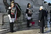 Since then, public events in memory of the event, like marches and parades, have been organized annually in all Italian cities - especially in those decorated with military valor for the war of liberation. Among the events of the festival program there is the solemn homage, by the President of Italy and other important officers of the State, to the chapel of the Italian Unknown Soldier (Milite Ignoto), buried in the Altare della Patria in Rome, with the deposition of a laurel wreath in memory of the fallen and missing Italians in wars.[15]