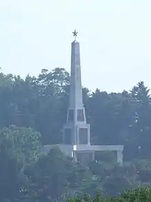 The Liberation Monument is a monument in Pyongyang, North Korea. It was built in 1947 to honour Red Army soldiers who took part in capturing Korea from Imperial Japan during the final stage of the Second World War. Soviet paratroopers took control of Pyongyang on August 24, 1945. The monument is composed of a stele surmounted by a five-pointed red star, with the entire structure attaining a height of 30 meters. The square base of the monument bears an inscription on each of its sides. The text, in Russian and Korean, describes the purpose of the monument. The monument is often visited by official delegations as well as by tourists and city residents. It has become traditional for newlywed couples to visit the monument as well.