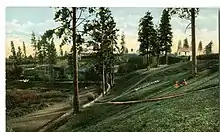 During the first three years of the park's existence, the city spent $6,000 on road-grading and irrigation projects.[2] Famed Pacific Northwest architect Kirtland Cutter drew up the park's original design plans. In 1908, renowned landscape architects the Olmsted Brothers drew up new design plans for the park, which included adding a stone pergola on the high ground overlooking a lake and the rest of the park grounds.[4] The ruins of that pergola are now located outside of the park, on the other side of I-90, and are sometimes referred to as "Spokane's Stonehenge."[1] Work on the Olmsted Brothers' plan was completed in 1913. The brothers said of Liberty Park at the time that it was "so much broken into hills and valleys with abrupt slopes and prominent projecting ledges that it is capable of uncommonly picturesque landscape gardening development."[4]