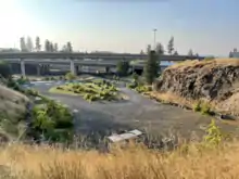 The Ben Burr Trail, for pedestrians and non-motorized vehicles, passes through the park and connects it to areas to the south in the Lincoln Heights neighborhood, and areas to the north and west such as Downtown Spokane, the Gonzaga University campus in the Logan neighborhood, and the Spokane River Centennial Trail.[9] The Ben Burr Trail largely follows the route of the former Spokane and Inland Empire Railroad, which formerly ran along the ridge atop the park's southern cliff. The National Register of Historic Places listed Frequency Changing Station is also perched atop the southern cliff along the route of the former railroad line.[10]
