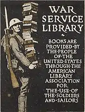 The Library War Service was established by the American Library Association in 1917 to provide library services to American soldiers training in camps and serving overseas in World War I.[1] Between 1917 and 1920, the ALA raised $5 million from public donations, erected 36 camp libraries, distributed 7 to 10 million books and magazines, and provided library collections to more than 500 locations, including military hospitals.[1] The Library War Service also provided books in Braille to soldiers that were blinded in battle.[2] Library War Service librarians wore uniforms, similar to those worn by other volunteer groups like the American Red Cross, and the Library War Service provides some of the earliest examples of women participating in uniformed war service overseas.[3] Millions of public libraries in the United States also participated in Library War Service activities, serving as collection points for books as well as places to organize and promote the War Service campaign.[2] The efforts of the Library War Service eventually led to the creation of many modern library services, including the creation of library departments in the Army, Navy, Veterans' Association and Merchant Marine, as well as the establishment of the American Library in Paris, which remains the largest English-language lending library on the European continent today.[2]
