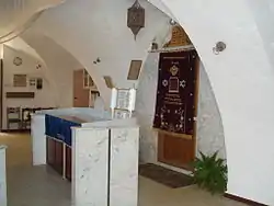 One enters the synagogue through a wooden door. The sanctuary is small, with low vaulted ceilings. The sanctuary is divided into three parts with the Ark carved into the wall in the center of the room. The bimah is situated perpendicular to the Ark and occupies a large part of the center of the room. The back of the room is the only place with a window and has a table and chairs to facilitate study. The walls are painted white.