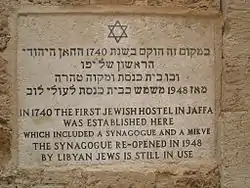 The Libyan synagogue of Jaffa (Hebrew: בית הכנסת לעולי לוב Beit haknesset lè'olei Loub) is an Mizrahi Jewish synagogue built inside a former hotel in 1948 by Jewish immigrants from Libya. Located on Rehov Mazal Daggim, the Pisces (Fish) Street, in the historical part of Jaffa, it is the oldest synagogue in Tel Aviv-Yafo.[1]