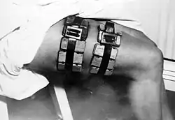The feeding was done through the use of specially-constructed small wooden boxes, 4 cm by 7 cm (1½" x 2¾"), developed by Weigl. The boxes were sealed with paraffin on the top which prevented the lice from escaping, and the underside consisted of a screen made of a fabric sieve, adapted by Weigl from sieves that were used by local peasants to separate wheat husks from the seeds. A typical box contained 400 to 800 lice larvae which would mature as the feeding took place. The sieve bottom allowed the lice to stick out their heads and feed on the human flesh. A standard feeding period took thirty to forty-five minutes, and was repeated with the same lice colony for twelve days. Usually, an individual feeder would accommodate from 7 to 11 boxes (of 400 to 800 lice each) on his or her leg, per feeding session. Typically men would place the boxes on their calves, to minimize the discomfort of the bites, while women feeders placed them on their thighs, so that the bite marks could be covered up by a skirt. A nurse had to watch over the feeding process as the lice would feed beyond the point of being gorged on the blood and could burst if left on the human flesh for too long.[3]