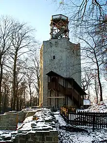 Since 1892, there has been a Society for the Preservation of Lichtenberg Castle, which was refounded in 1995 as the "Friends of Lichtenberg Castle" (200 members). In 1861 the bergfried, which had become a 15-metre-high (49 ft) ruin, collapsed and was demolished. Around 1900, the preservation society built a new tower on the old foundations, with the same hexagonal plan, which today has a wooden viewing platform with a height of about 25 metres. From the observation deck there are good views over the Harz Foreland to the Brocken. Investigations of the castle well showed it to be about 60 m deep and dug by hand. Since 2005, there has been a replica trebuchet, a medieval catapult engine, on the castle site. Next to the castle is a tourist restaurant with a beer garden and hotel.