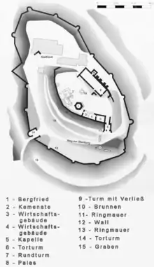 The castle comprises an upper and lower wards. The upper ward lies on an oval plateau, 45 metres × 80 metres in area. Here there are various residential and domestic buildings, towers and the castle well, surrounded by a 1.6-metre-thick (5.2 ft) enceinte. In a residential building measuring 10 metres × 8.5 metres is a ladies' apartment (Kemenate) an old hot air heating system was uncovered during excavations. A little below the inner ward there is a 32-metre × 8-metre palas, with its great hall, as well as a neighbouring tower and dungeon.