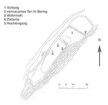 The castle is built on the top of a narrow hill near Haldenstein with steep cliffs on two sides. North-east of the castle was a ditch that protected the outer wall. The outer wall encloses a rough square courtyard. The original gate in the outer wall was sealed up at some point and the location of the new gate is unknown. A three-story living quarters building was built on the highest point of the hilltop. It is an elongated rectangle with a door on the south-east side. As that door opens out onto a cliff, a wooden platform probably connected the door to the courtyard. A vertical joint in the walls of the residence indicates that it was expanded at least once. A large cistern in the living quarters held water for the castle.[4]
