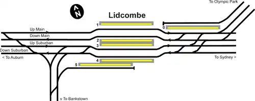 Lidcombe has six platforms: five for ordinary suburban services, and one for the shuttle between Lidcombe and Olympic Park – officially Platform 0 but known simply as the Olympic Park Sprint platform. During times of special events, some train services may make additional calls at Lidcombe.[6][7]