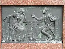 On the left side of the plinth of the statue of Johan Peter Emilius Hartmann on Sankt Annæ Plads is a bronze relief depicting the "Tavlebordsduetten" (playing table) scene in Liden Kirsten. On the other side of the plinth is another bronze relief with a scene from his ballet Valkyrien. The monument is from 1905 and was created by August Saabye.