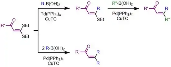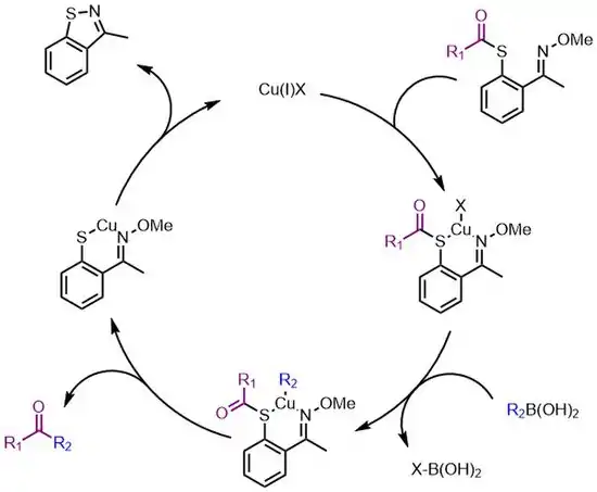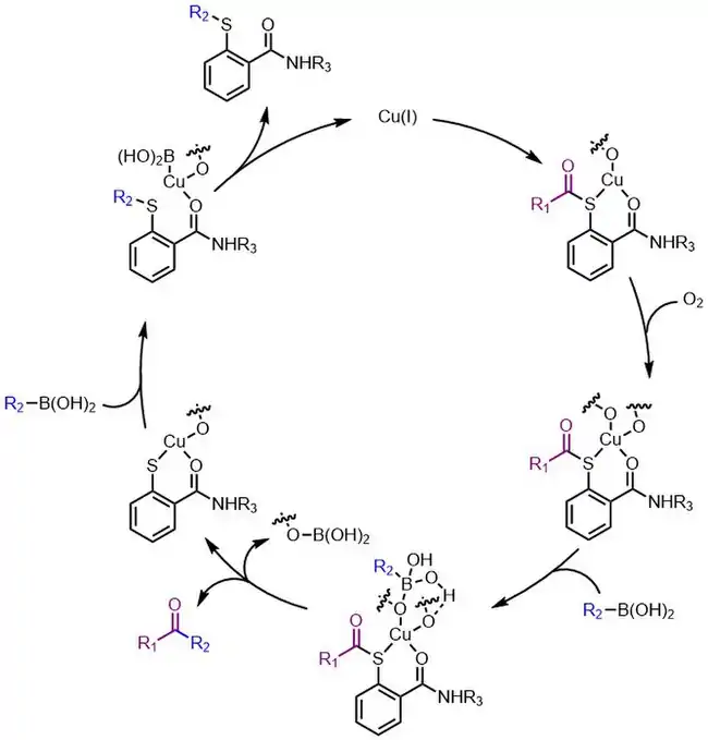 Second generation approach renders the reactions catalytic in copper by using an extra equivalent of boronic acid under aerobic, palladium free conditions.[3] The additional equivalent liberates the copper from the sulfur auxiliary and allows it to turn over. This chemistry is limited to thioesters and sulfides and could also be limited by the cost and availability of the organoboron reagent.