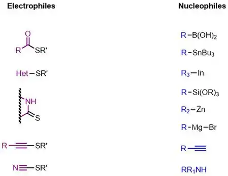 Liebeskind-Srogl reaction is most commonly seen with sulfide or thioester electrophiles and boronic acid or stannane nucleophiles but many other coupling partners are viable. In addition to alkyl and aryl thioesters; (hetero)aryl sulfides, thioamides, sulfanyl alkynes, and thiocyanates are competent electrophiles.[2] Virtually any metal-R bond capable of transmetalation has been demonstrated.[2] Indium derived nucleophiles require no copper or base. Note that this scope is applicable for the first generation coupling as the second and third generations are mechanistically distinct and have only been demonstrated with thioesters capable of forming the six-membered metallocycle, boronic acids, and stannanes.