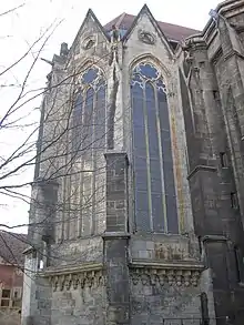 In the last quarter of the 13th century, the Romanesque choir was replaced by the High Gothic east building consisting of a transept and a staggered hall. As early as the 19th century, the ground plan analogy with Regensburg Cathedral, whose foundation stone was laid in 1275,[6] was noticed without research having a satisfactory explanation so far. Weber assumes that in Arnstadt, too, a basilical solution was initially aimed at.[2]: 149–154 Probably under the impression of the hall buildings taking place in succession to St Elisabeth's Church in Marburg, there was also a change of plan in Arnstadt and the execution of the present hall building. Stylistic references also seem to exist to French Rayonnant buildings, such as the choir solution of the Church of Our Lady of Chambly or the tracery of Beauvais Cathedral. Since a gallery (which was removed again in the 19th century) was built in the southern part of the east building for the incorporated nunnery, it can be assumed that the interior work extended into the twenties of the 14th century. In 1333, the Liebfrauenkirche was designated as "Ecclesia parochialis" and thus as the main parish church of the town. In addition, the north choir accommodated the burial place and memoria of the Counts of Schwarzburg. The three-aisled structure of the choir building corresponded to the shared use of the space at that time.