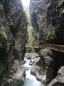Liechtensteinklamm (Liechtenstein Gorge) is a particularly narrow gorge with walls up to 300m high, located in the Austrian Alps 50 km south of Salzburg. It is around 4 km long and named after Johann II of Liechtenstein who had the walkways installed in 1875.