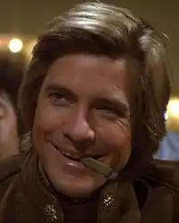 Lieutenant Starbuck of the Colonial Service, played by Dirk Benedict, is a fictional character in the 1978 science fiction television series Battlestar Galactica. Starbuck is a Viper starfighter pilot, gambler, and smoker of "fumerellos" (cigars). He is involved with Lieutenant Athena and socialator Cassiopeia, and best friend of Captain Apollo.
