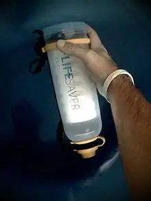 The bottle's interchangeable filter can purify between 4,000 and 6,000 litres (1,050 to 1,585 gallons) before it stops working and needs to be replaced.[2] It filters out objects bigger than 15 Nanometres—including viruses, bacteria, and cysts.[3][4] The carbon filter does not require chemicals.[4] The process of filtering the water takes 20 seconds, allowing for 0.71 litres (1.5 pints) of water to be filtered.[4] Once a filter has reached its limit, it will not allow contaminated water to be drunk.[4] The LiveSaver bottle has been used by soldiers for drinking water as well as cleaning wounds.[2][3][4]