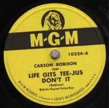 "Life Gets Tee-Jus Don't It" is a country music song/spoken word recital that was written and sung/spoken by Carson Robison (backing by The Pleasant Valley Boys) and released on the M-G-M label (catalog no. 10224-A). In August 1948, it reached No. 3 on the Billboard folk best seller and juke box charts.[1] It was also ranked as the No. 7 record on Billboard's 1948 year-end folk record sellers chart.[2]